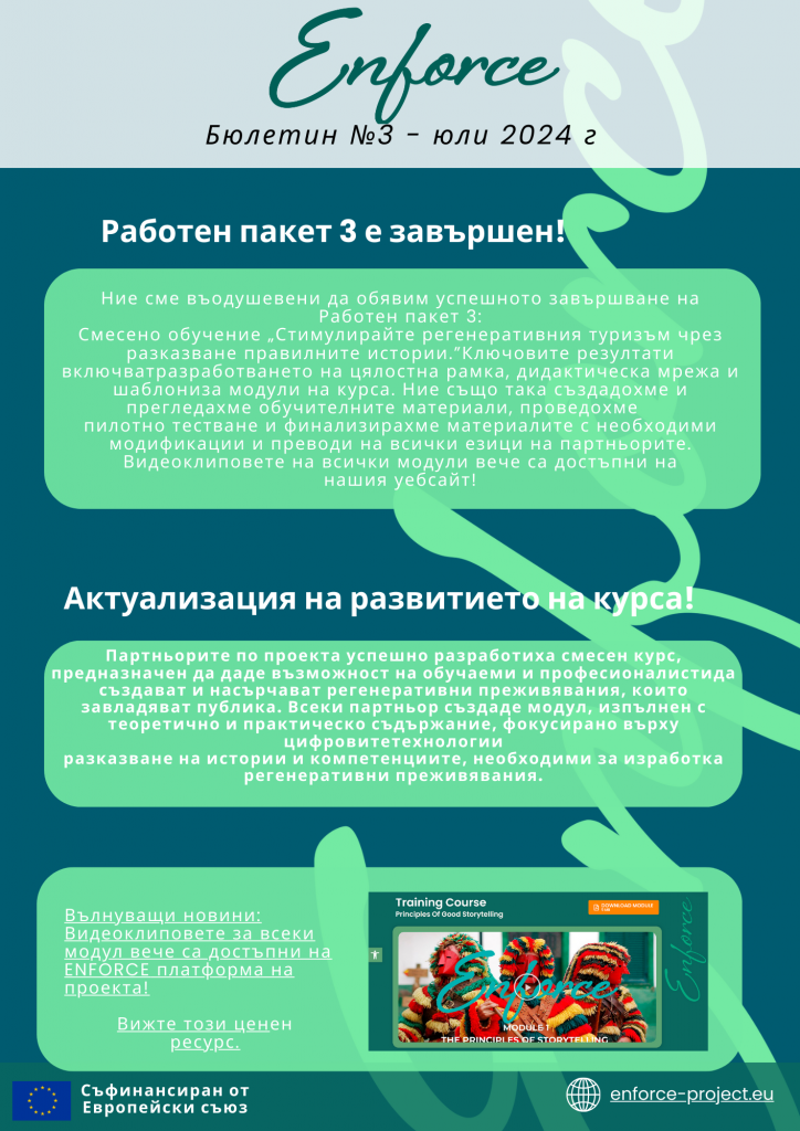 Въпреки че това беше последната ни транснационална среща, духът на ENFORCE продължава да живее чрез историите, които споделихме, инструментите, които създадохме, и общностите, които помогнахме да се свържат. Благодарим на всички, които бяха част от това регенеративно пътуване!