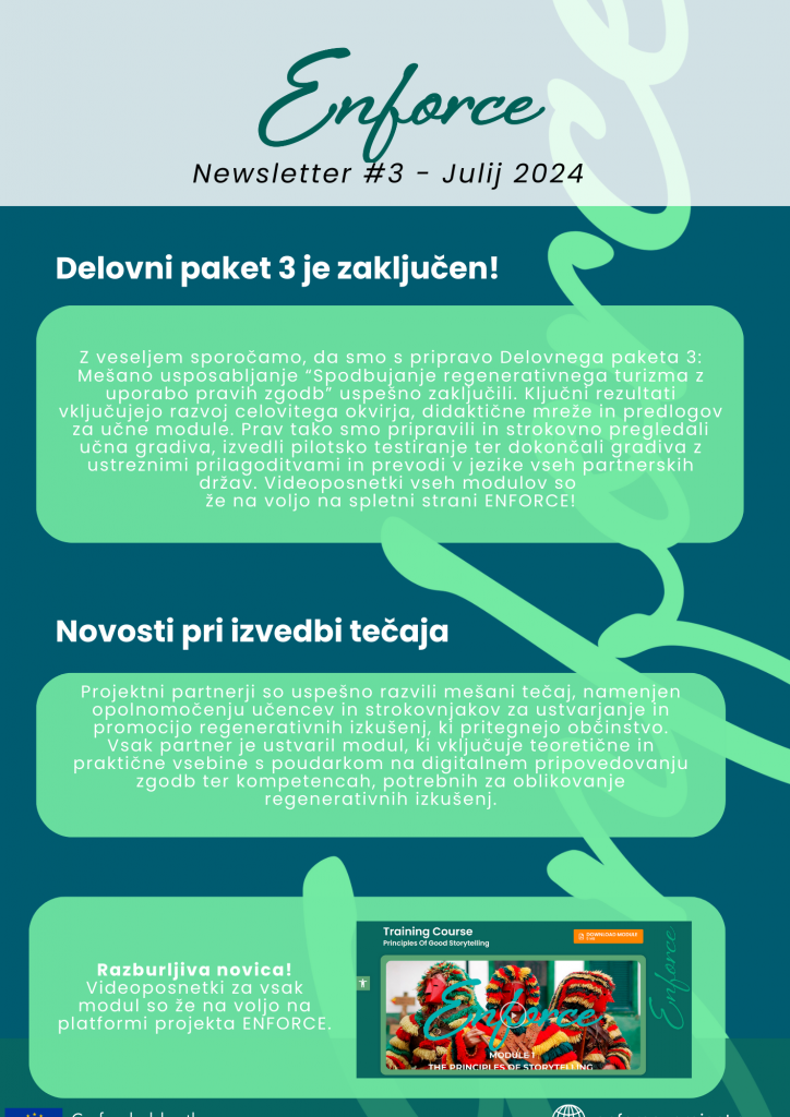 Čeprav je bilo to naše zadnje transnacionalno projektno srečanje, duh ENFORCE živi naprej v zgodbah, ki smo jih delili, orodjih, ki smo jih ustvarili, in skupnostih, ki smo jih pomagali povezati. Hvala vsem, ki ste bili del tega regenerativnega potovanja!